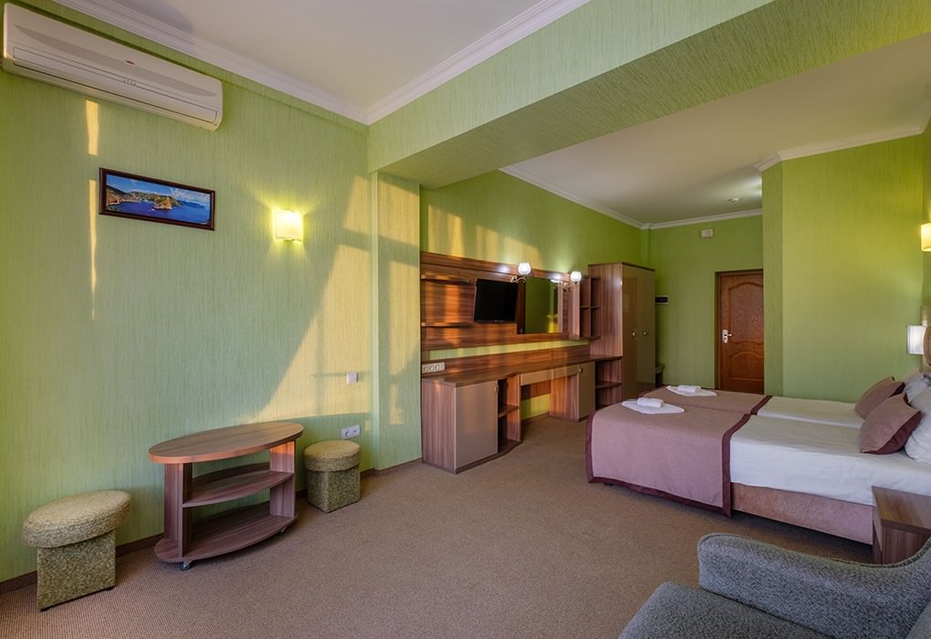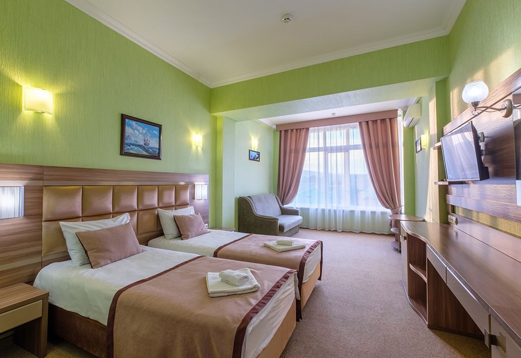 Площадь номера - 25 кв.м. 1 комната. 2 осн. места. В номере: телевизор; холодильник; кондиционер; душ; туалет; фен; сейф; 1-спальные кровати; чайник. 2 доп. места: Диван - Может быть установлен без ограничения по возрасту.