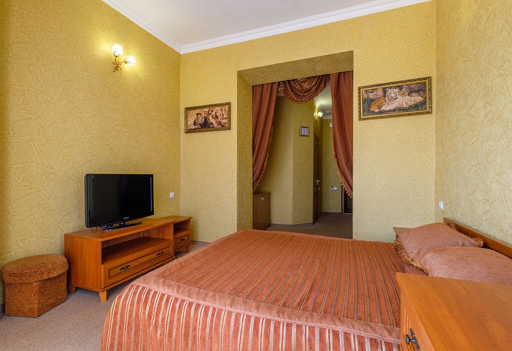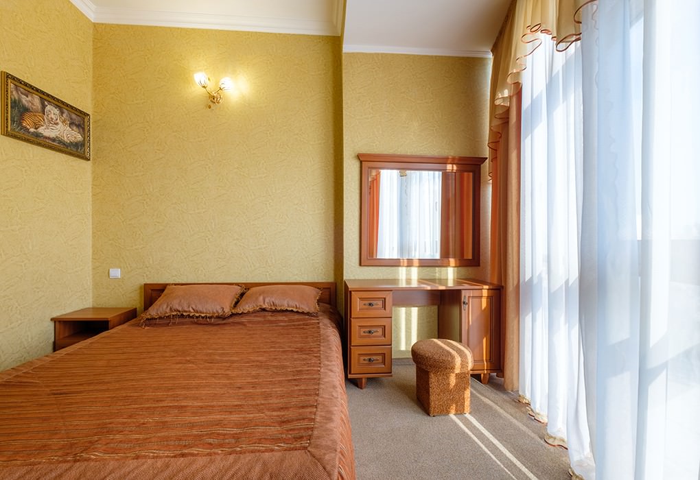 Площадь номера - 27 кв.м. 1 комната. 2 осн. места. В номере: телевизор; холодильник; кондиционер; душ; туалет; фен; сейф; 2-спальная кровать; чайник. 1 доп. место: Кресло-кровать - Может быть установлено без ограничения по возрасту.