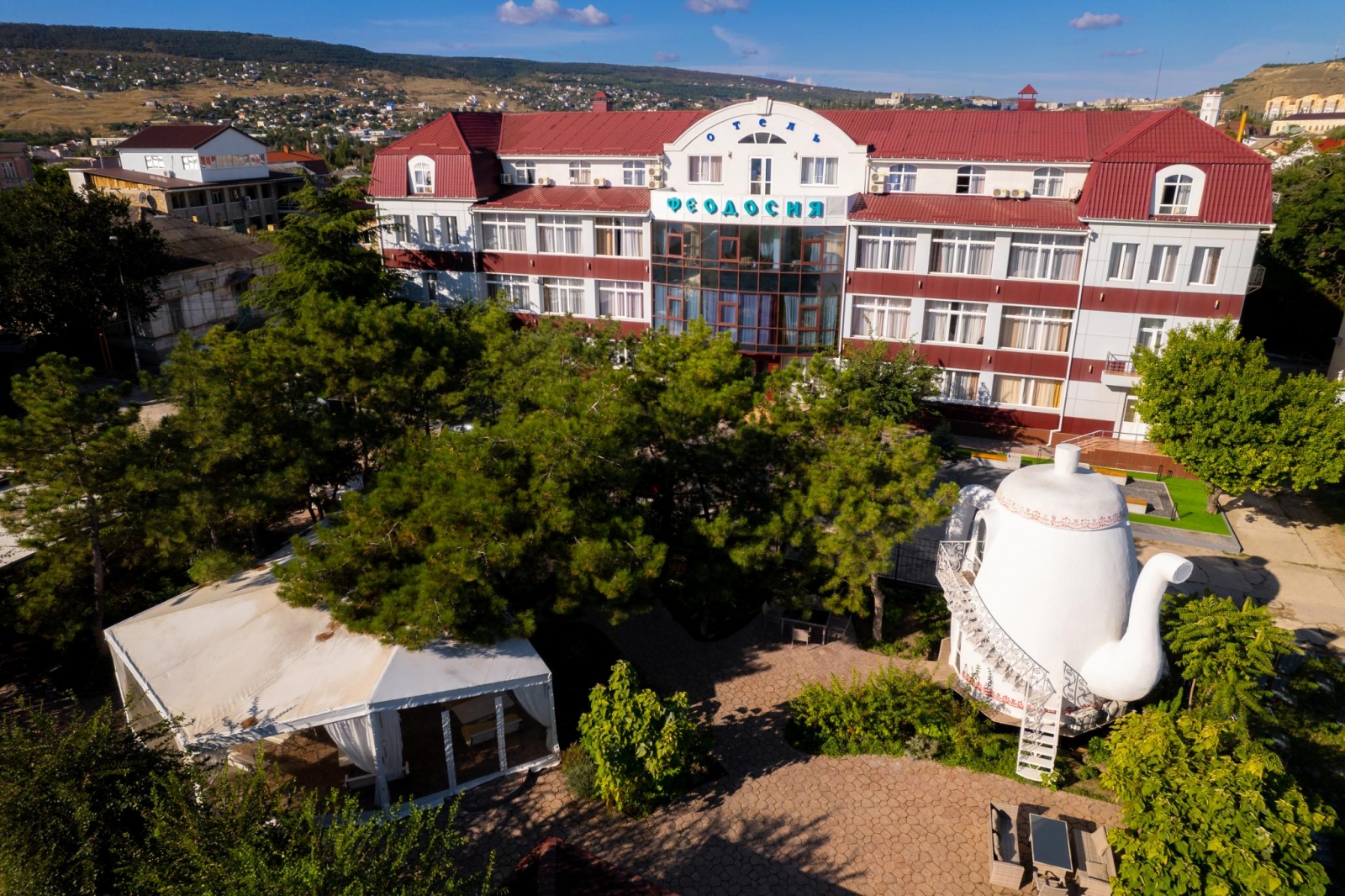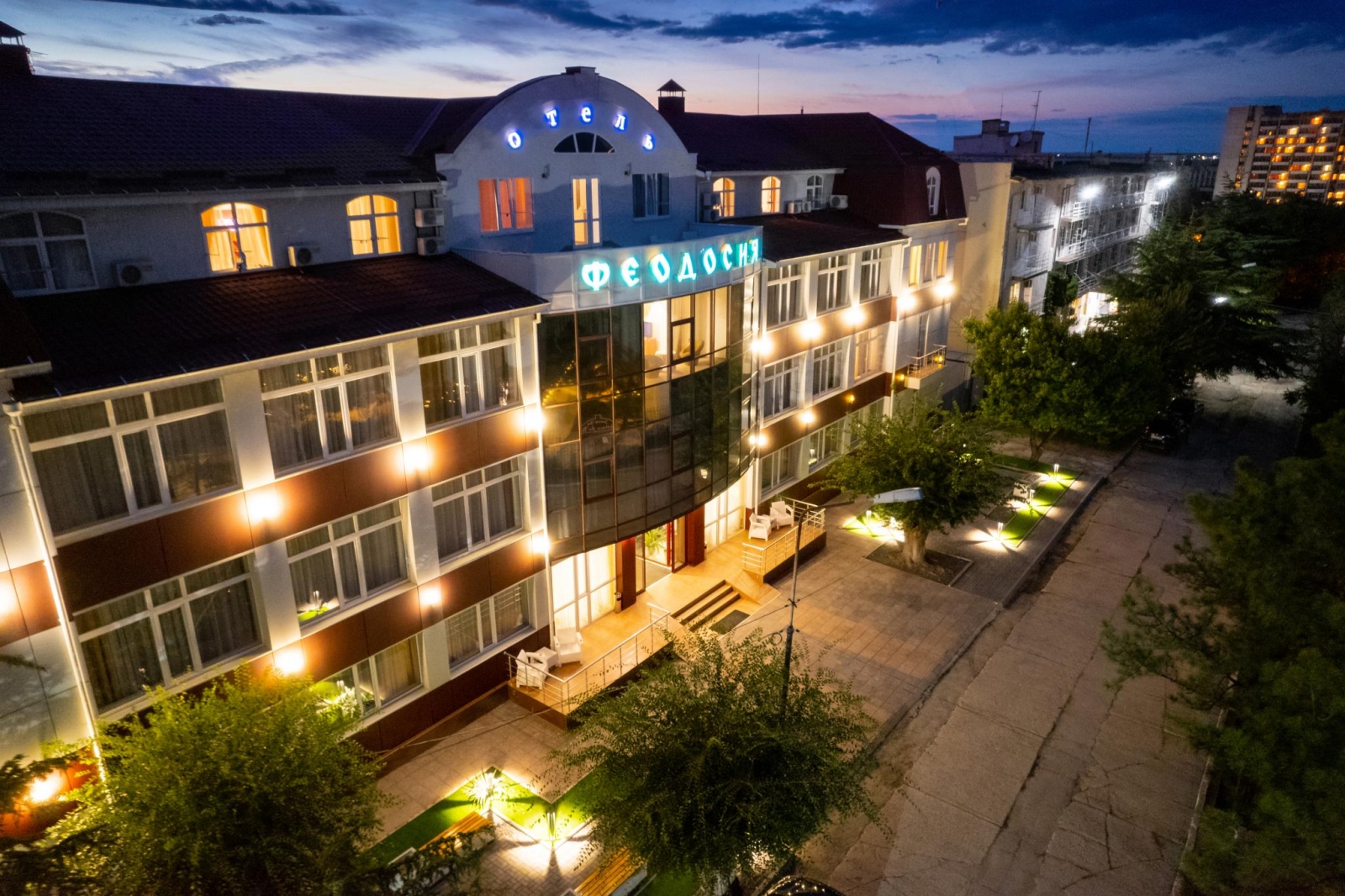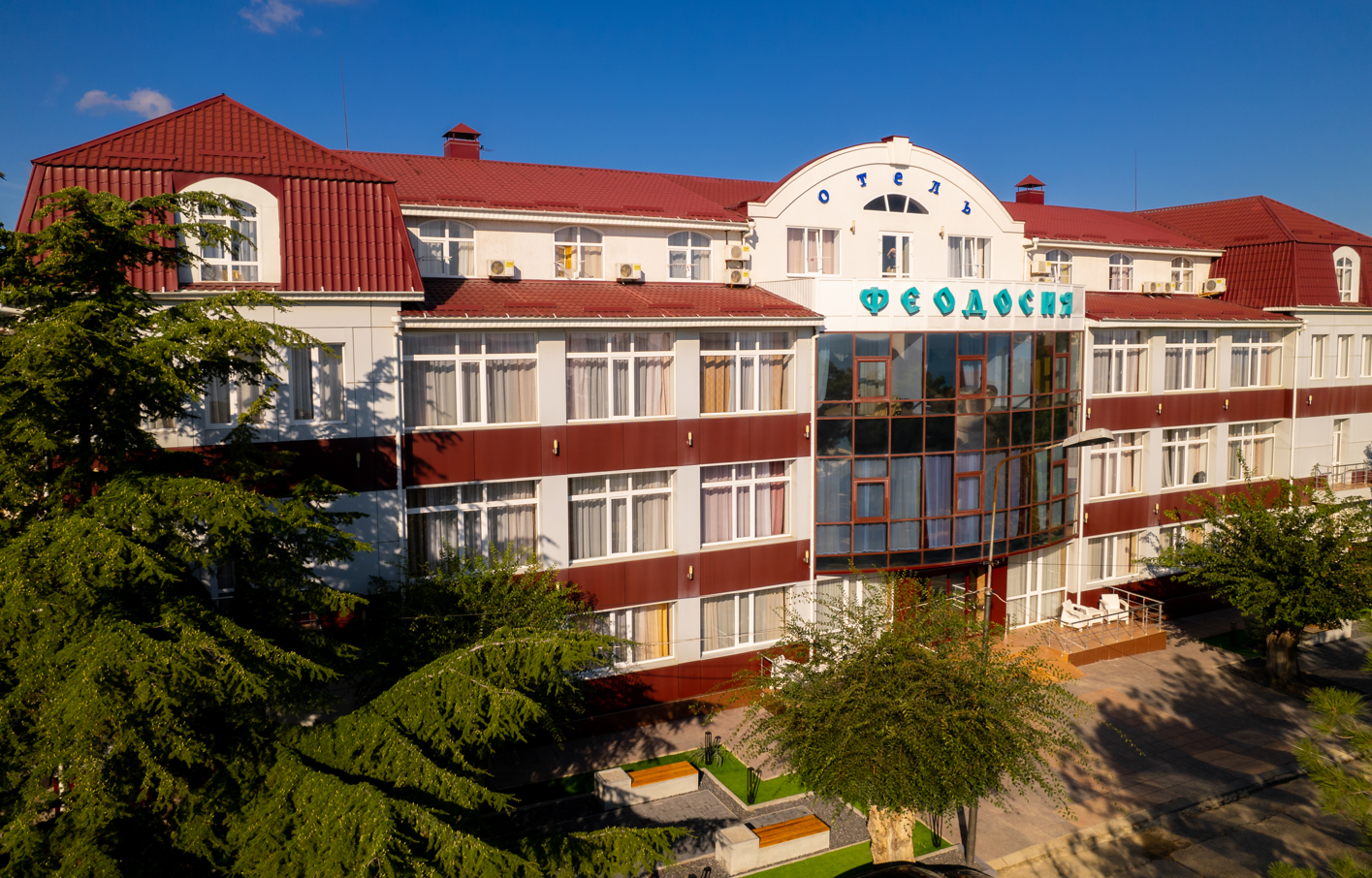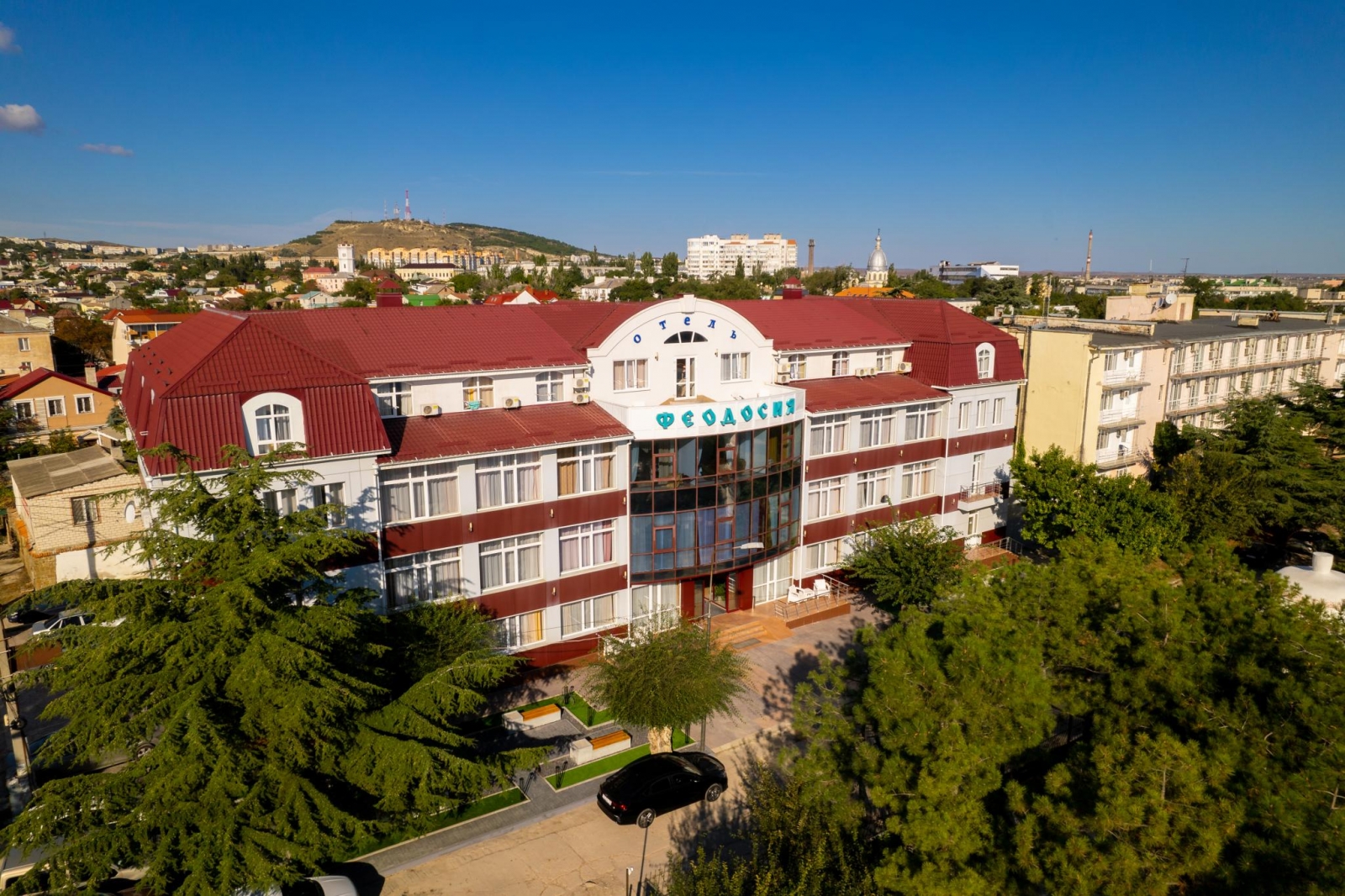 Отель "Феодосия" имеет классификацию три звезды и удачно сочетает в себе лучшие традиции европейского сервиса и колорит древнего приморского города с его великолепным лечебным воздухом. Отель «Феодосия» находится в нескольких минутах ходьбы от главной набережной г. Феодосии и галереи знаменитого мариниста Ивана Айвазовского. Недалеко от отеля находится деловая часть города и железнодорожный вокзал, а также один из старейших и наиболее посещаемых соборов Феодосии - Собор иконы Казанской Божьей Матери. Отель расположен на тихой улице, что позволяет насладиться спокойным отдыхом и изоляцией от шума города и курортной зоны. Отель «Феодосия» является оптимальным местом проживания, как для деловых людей, так и для любителей туризма и истории.